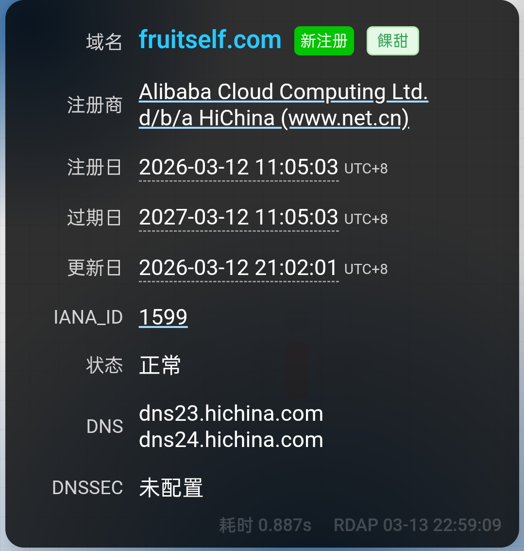 查了下没有太多近似商标,在抖音问了下主播,说缺少显著性,成功率不高,我还是提交申请了,并注册了域名fruitself.com,我承认我有赌的成分,反正商标注册和域名注册不是太贵。