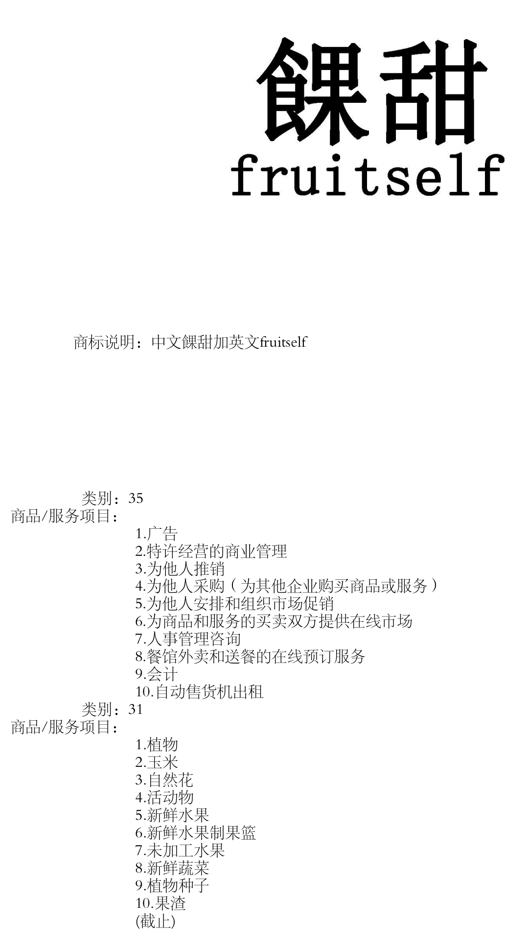 餜甜的英文我选择的是fruitself,是由fruit和itself组合而成,去掉一个重合的it,含义是水果本味,指自然成熟的水果